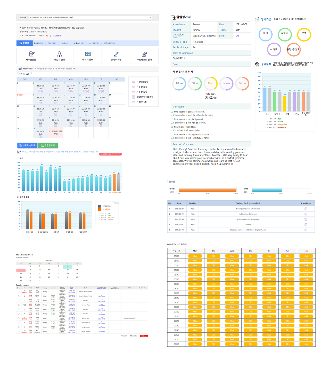 레벨테스트, 일일평가서, 단계별보고서, 매월시험, 수강내역확인 등 다양한 마이페이지 기능이 포함되어 있으며 관리자는 전체 수업진행 현황과 수강신청 내역, 회원관리, 강사관리, 홀드, 정산 등 전반적인 사항을 관리할 수 있으며 강사는 일일 종합 스케줄표를 이용하여 수업진행을 할 수 있습니다.