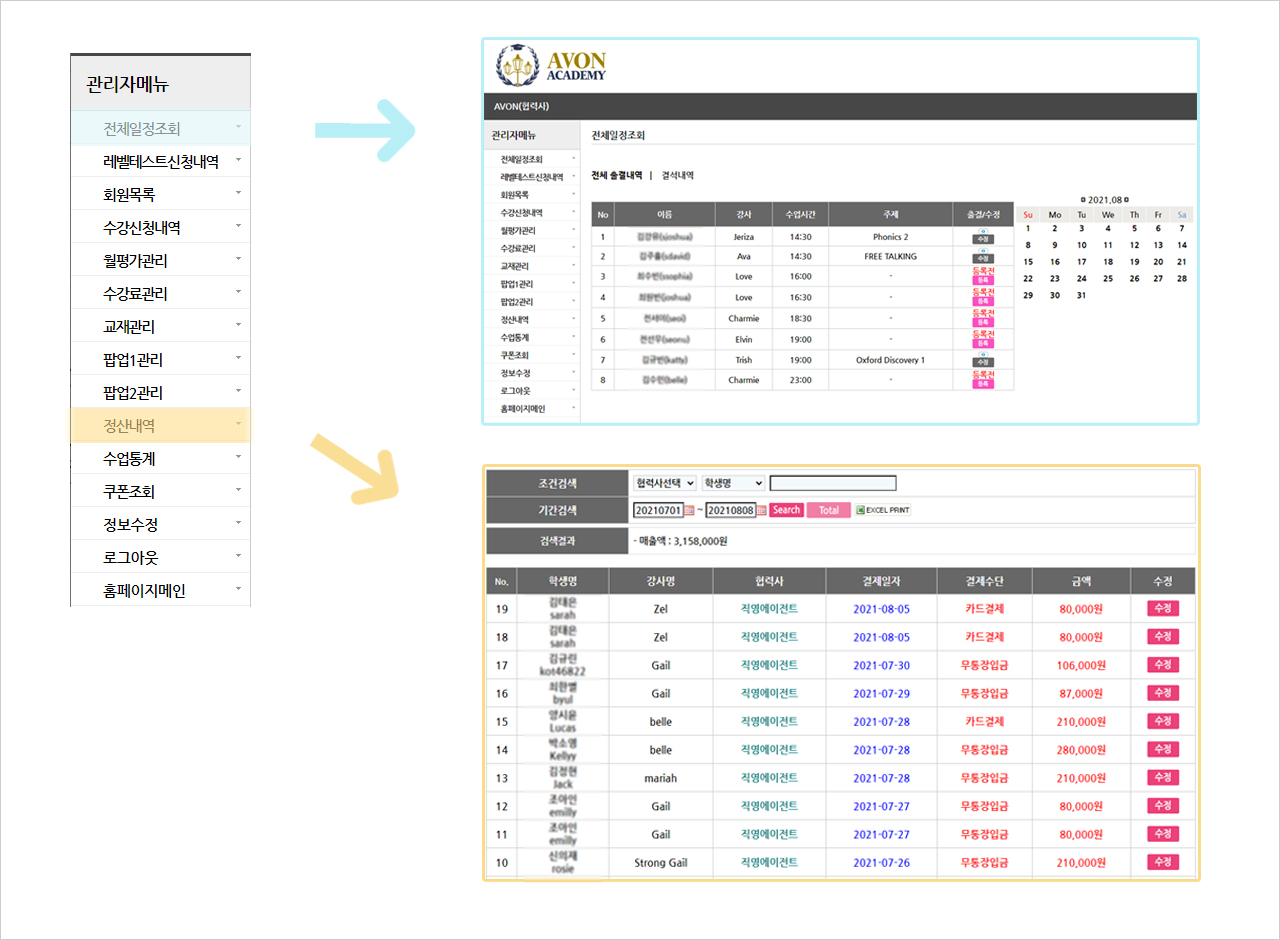 사이트관리, 회원관리, 강사관리, 레벨테스트, 수강관리, 교재/시험관리. 홀드관리, 전체일정표, 정산관리, 강사임금관리 |